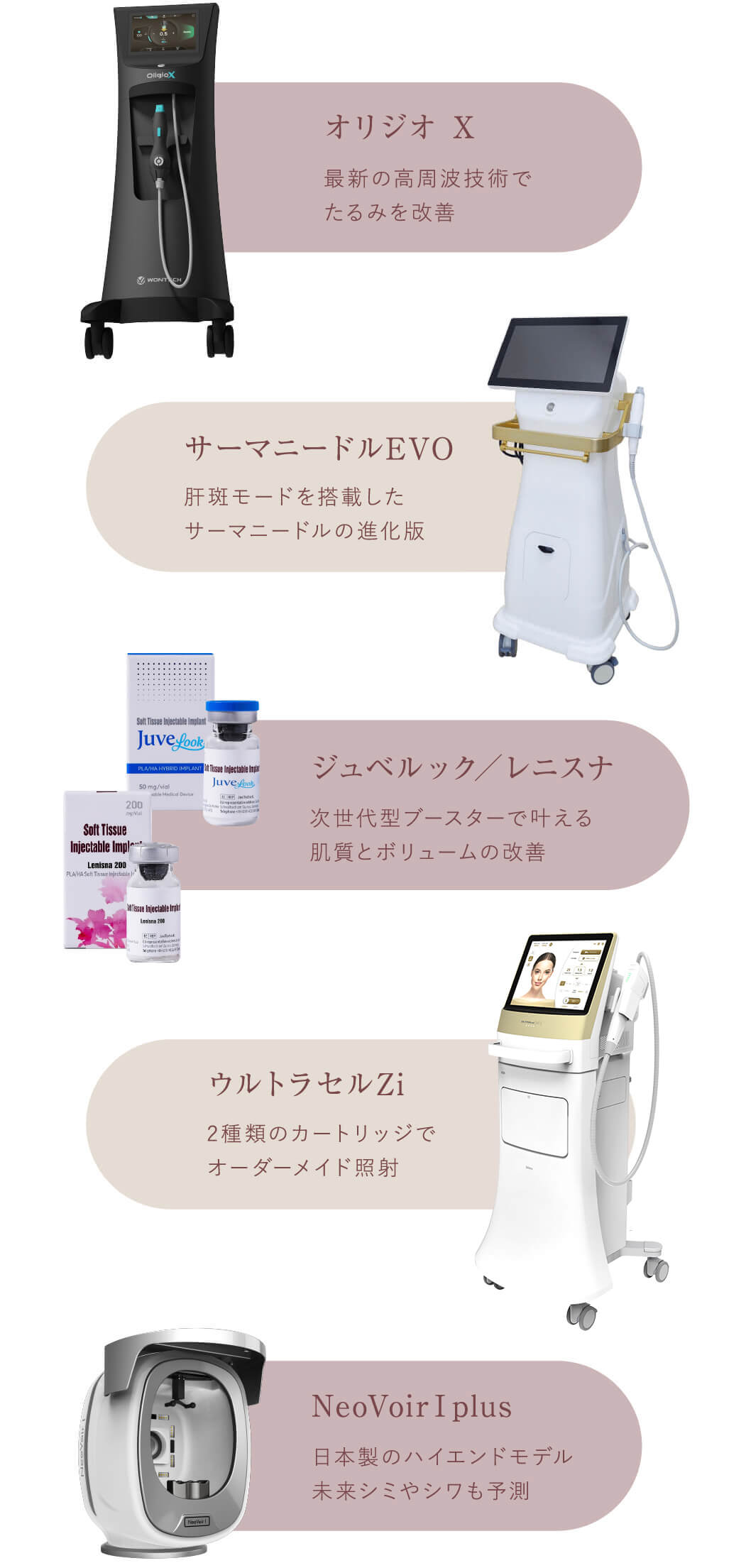 3. 日本製のハイエンドモデル肌分析機「NeoVoirⅠPLUS」、立体的なタイトニングでたるみ改善と、キメや毛穴など肌質改善効果も期待できる最新高周波「OlihioX(オリジオX)」、ニードルによる創傷治癒とRF(ラジオ波)による熱刺激でシミ・くすみ・肝斑・毛穴・ニキビ跡などのあらゆる肌悩みに対応した「サーマニードルEVO」などの機械と、そのほか薬剤を取り揃えております。